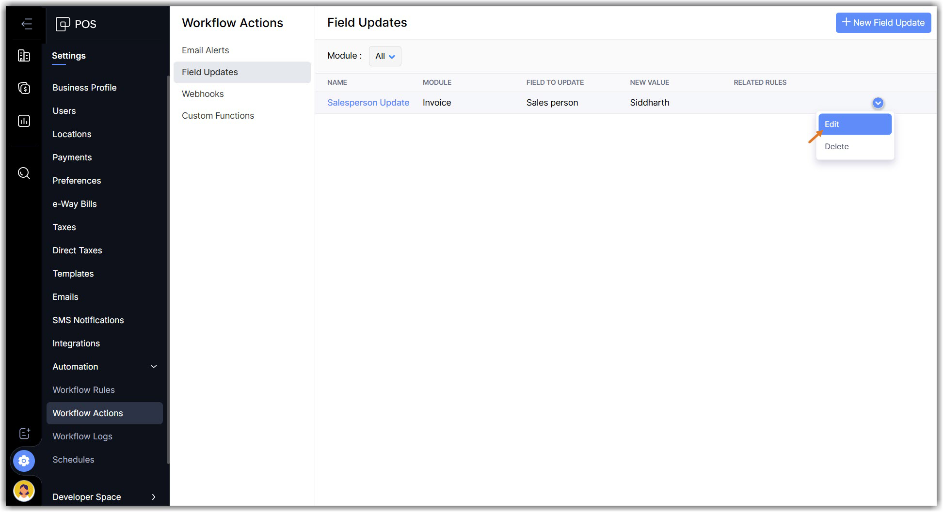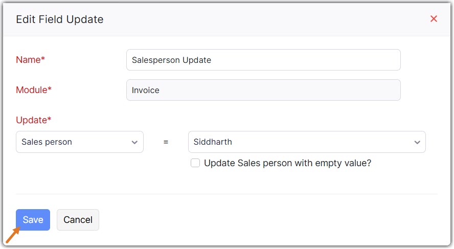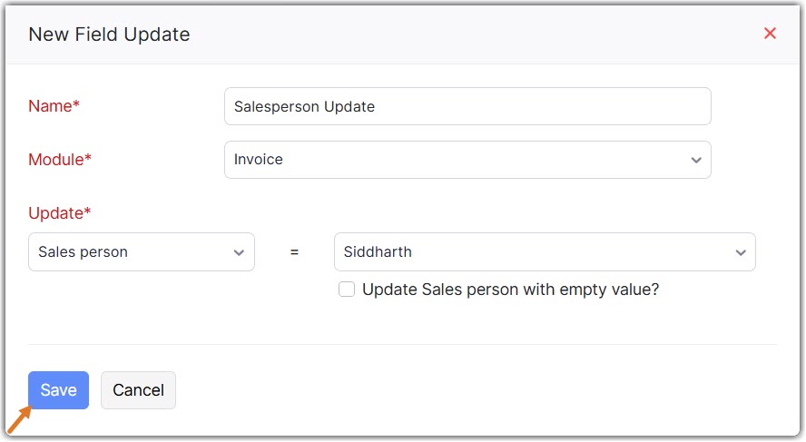 Imagine you run an electronic store where you want to assign high value home delivery orders to the senior salesperson in your organization automatically. You can create a field update with the senior salesperson and associate it with the workflow rule. Whenever a home delivery order value exceeds your limit, the sales order will be assigned to the senior salesperson.