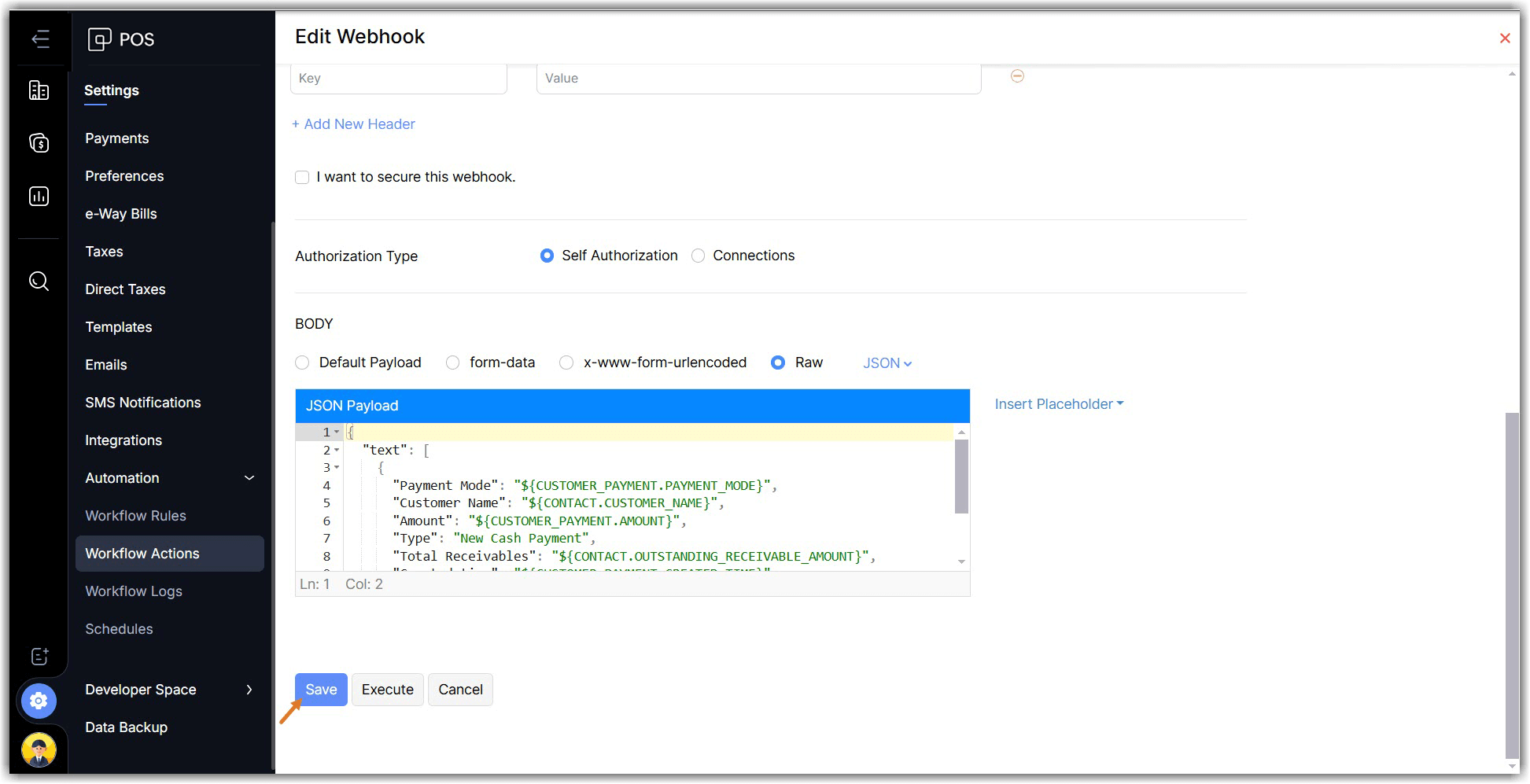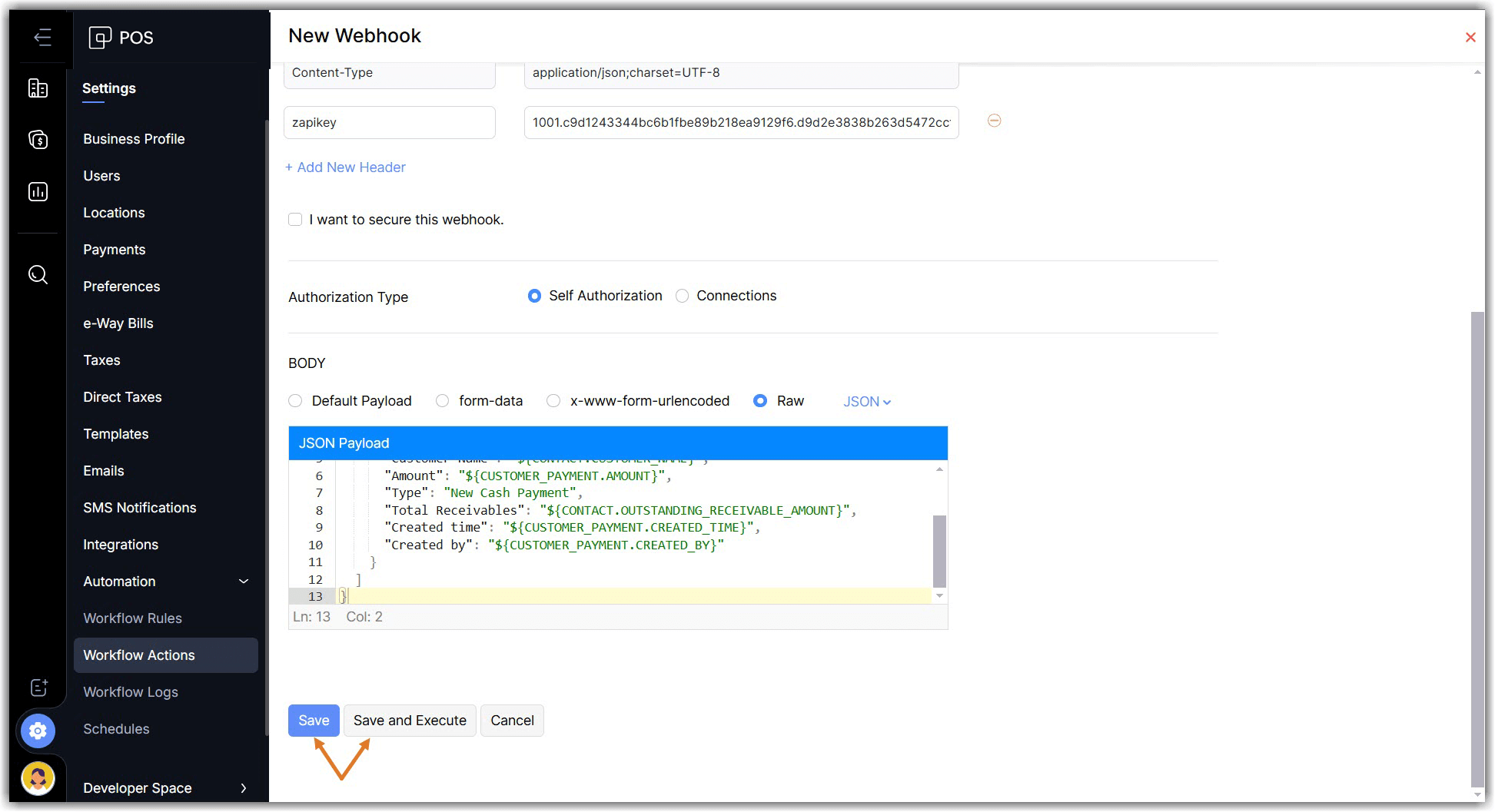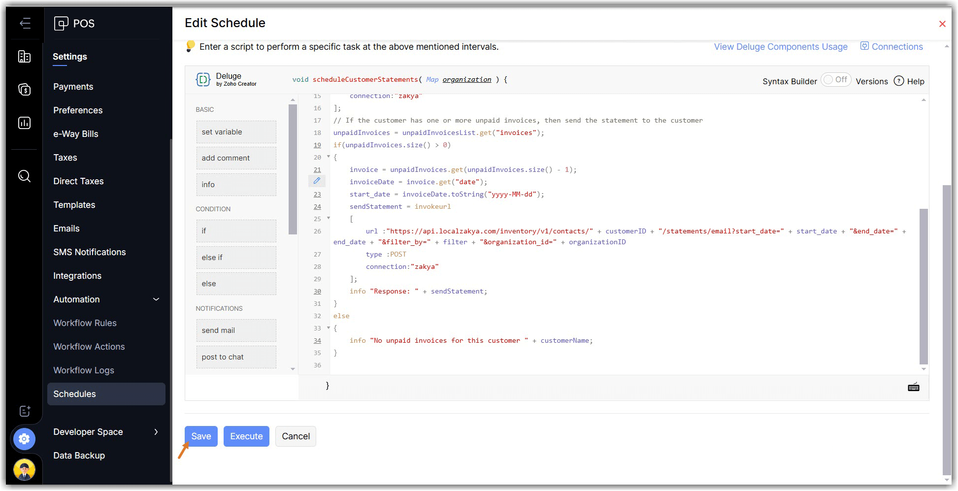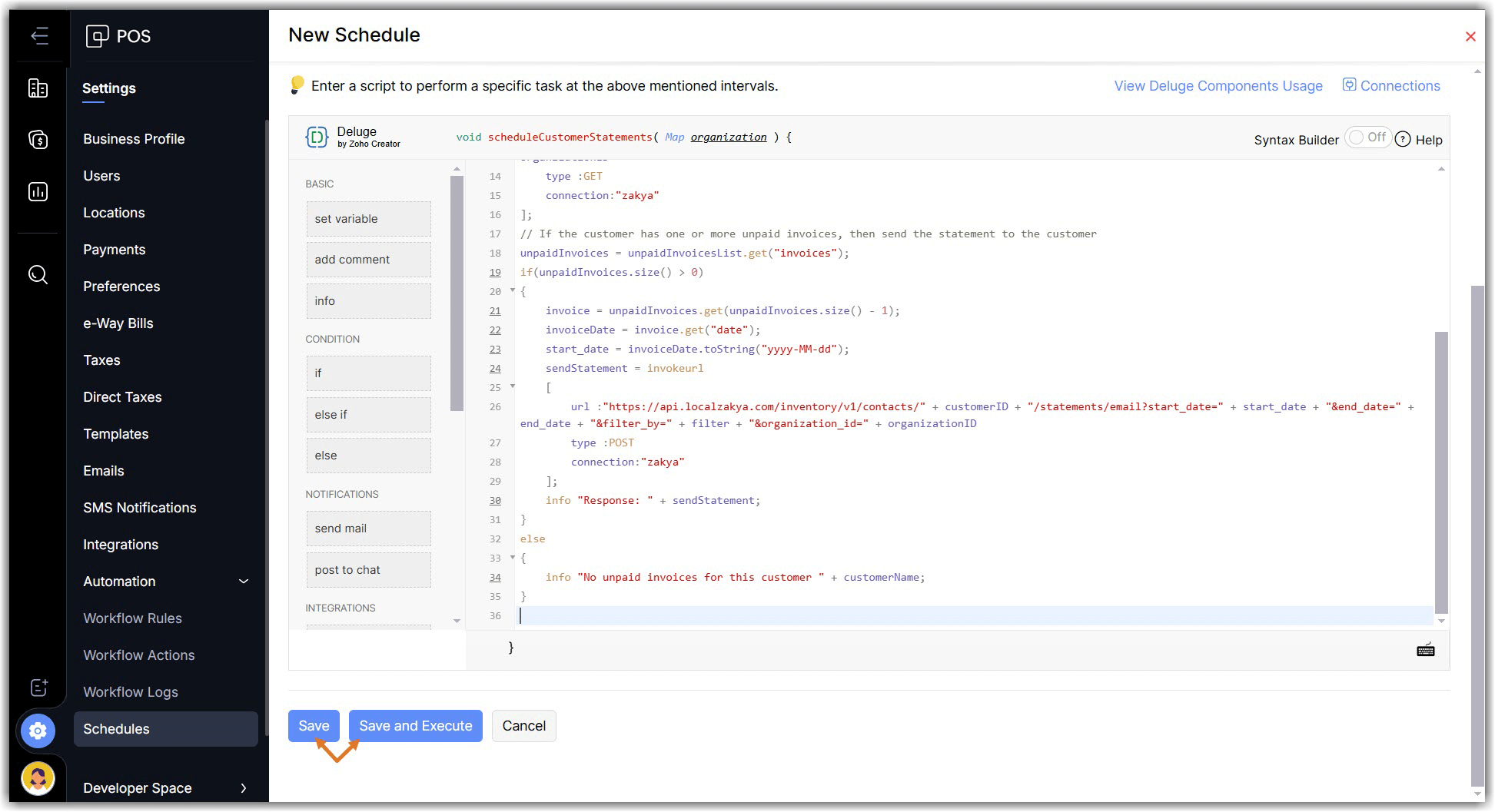 Enter your deluge script to perform the required action in Zoho POS and click Save and Execute to check if the custom function works properly, or click Save if you want to execute it later.