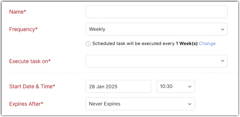| Frequency | Frequency and recurrence pattern for the schedule to be executed. This can be hourly, daily, weekly, monthly, or yearly. Hourly: The task will be executed every hour of the day (or based on your recurrence pattern). Daily: The task will be executed every day (or based on your recurrence pattern). You can choose to exclude the weekends. Weekly: The task will be executed once a week. Select the day of the week on which the task should be executed. Monthly: The task will be executed once a month. This can be a specific date or a day in a month. Yearly: The task will be executed once a year. You can select the month and specify the date of execution or specify the day. |