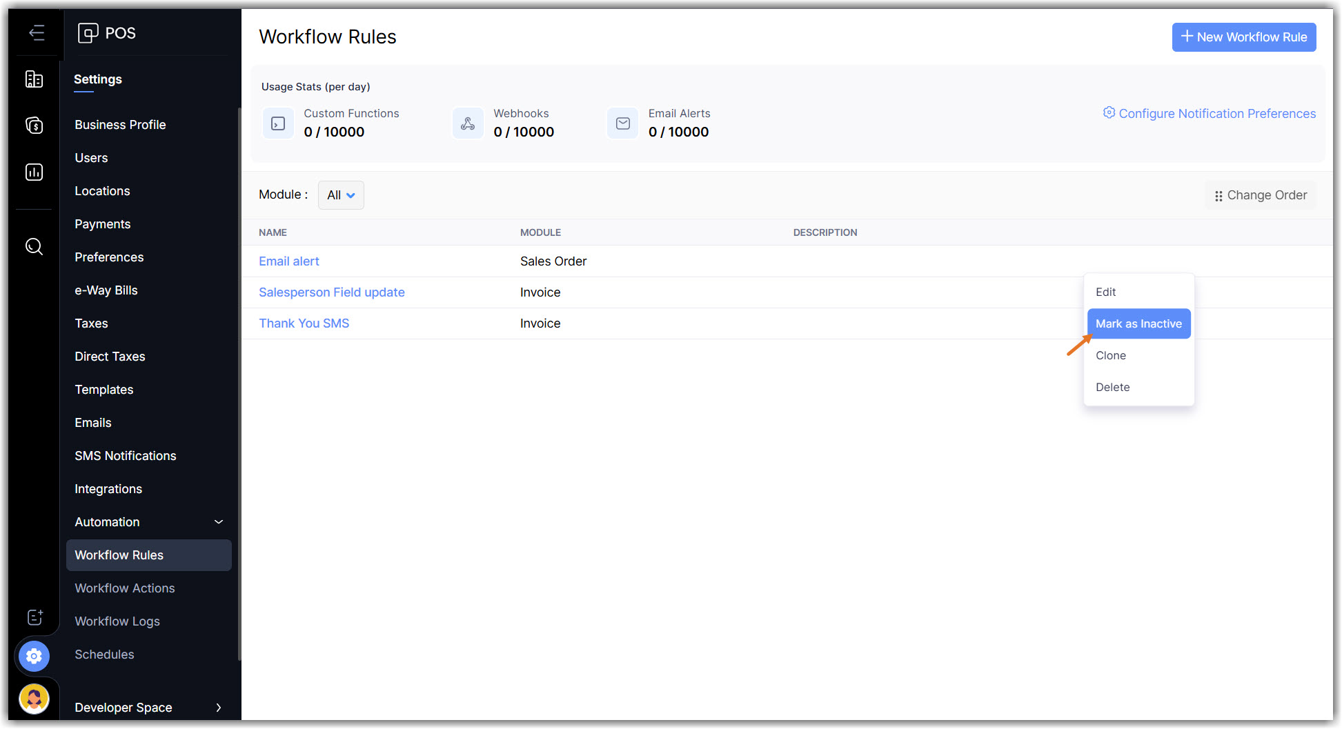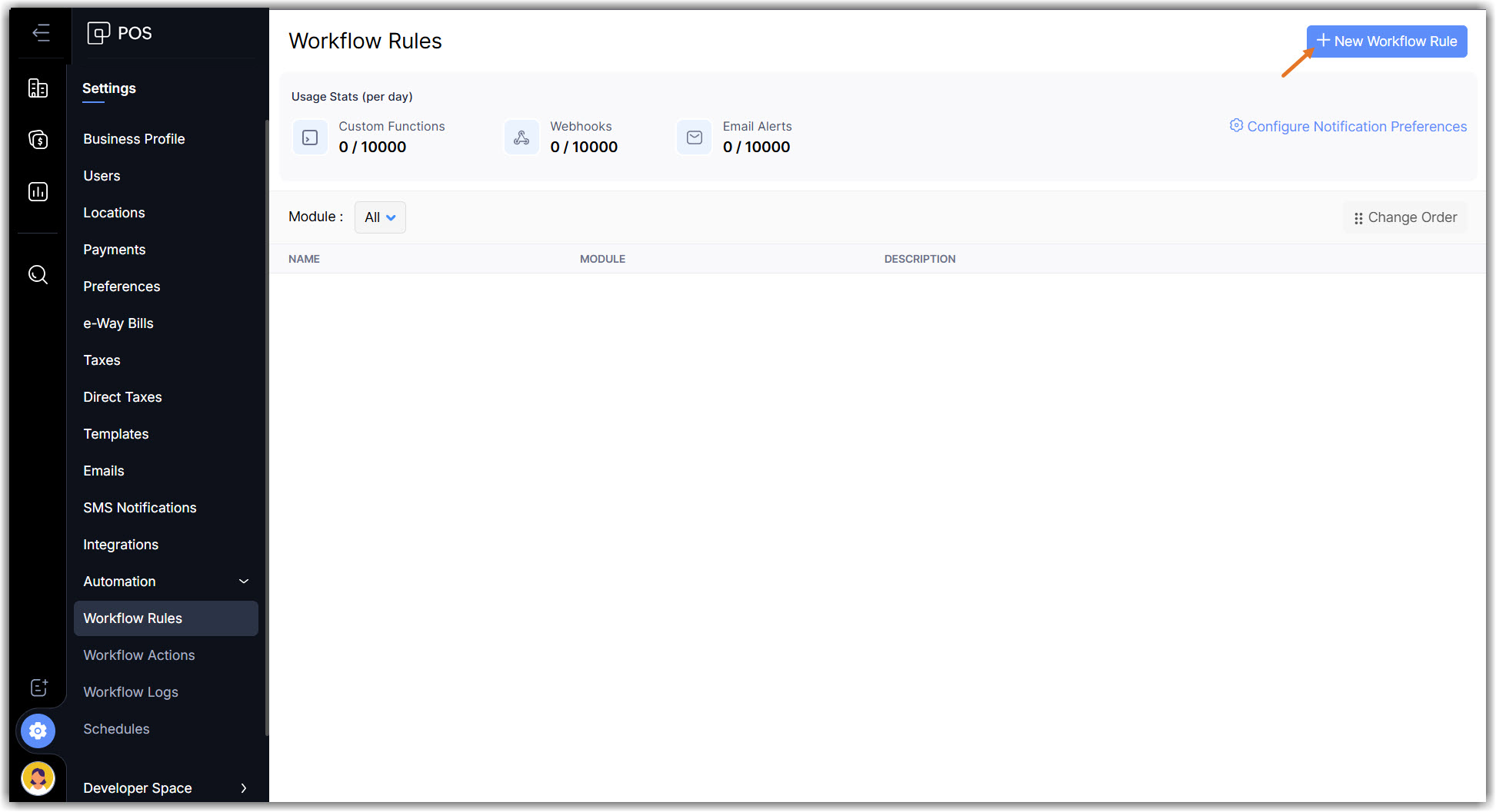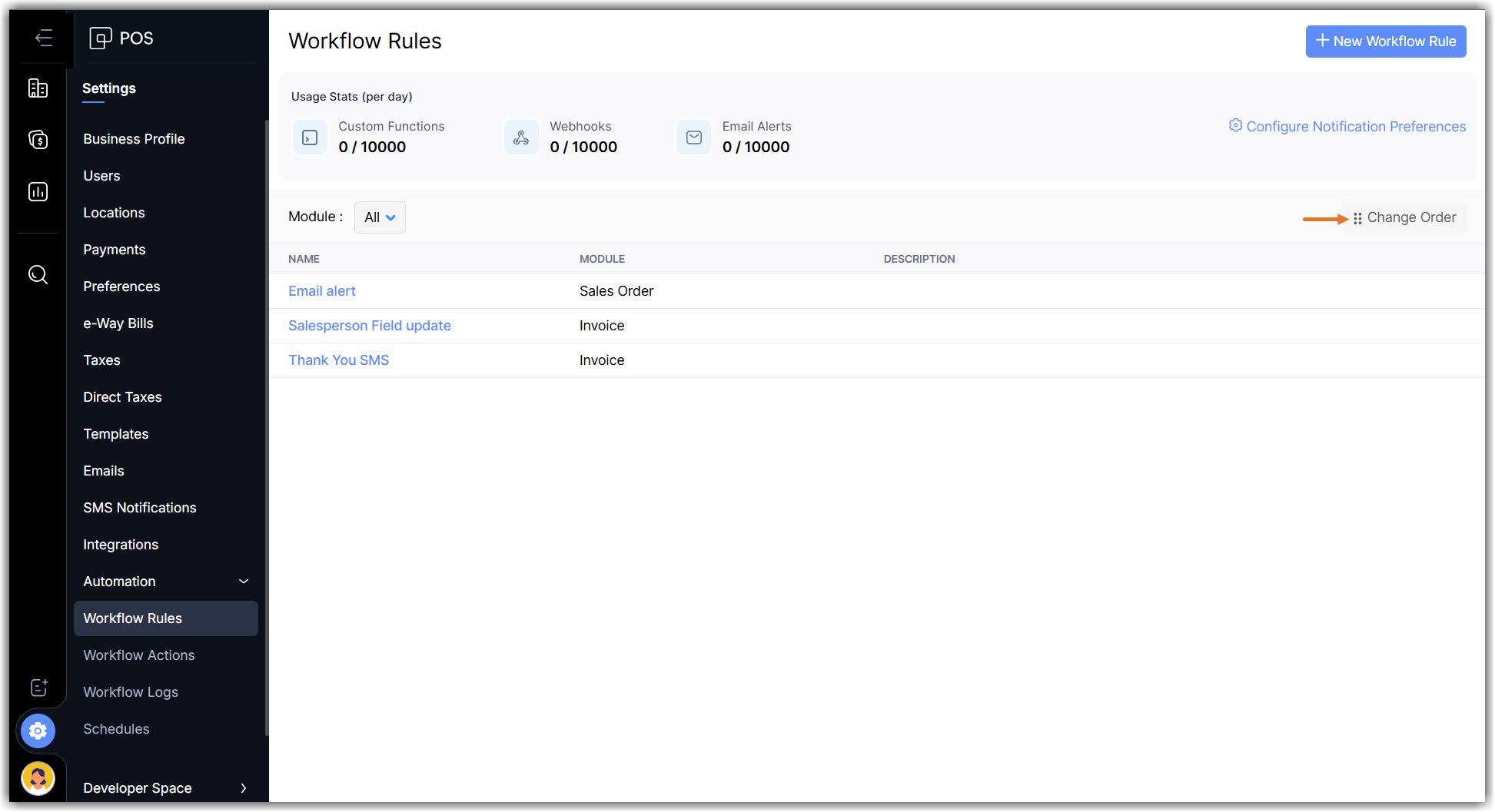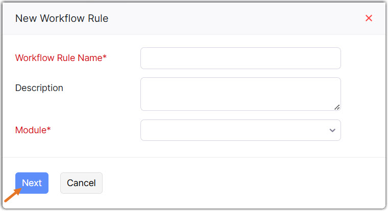 Module: Select the module for the workflow rule from the drop-down menu. For example, Invoice, Order, Customer Payments, and much more.