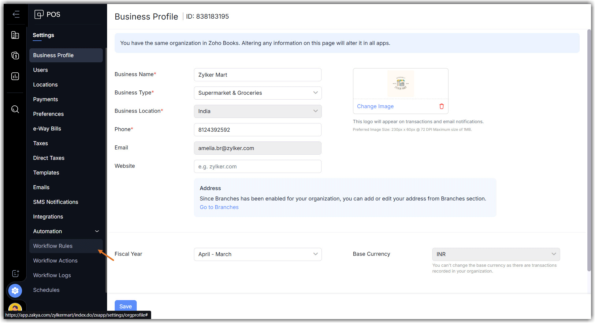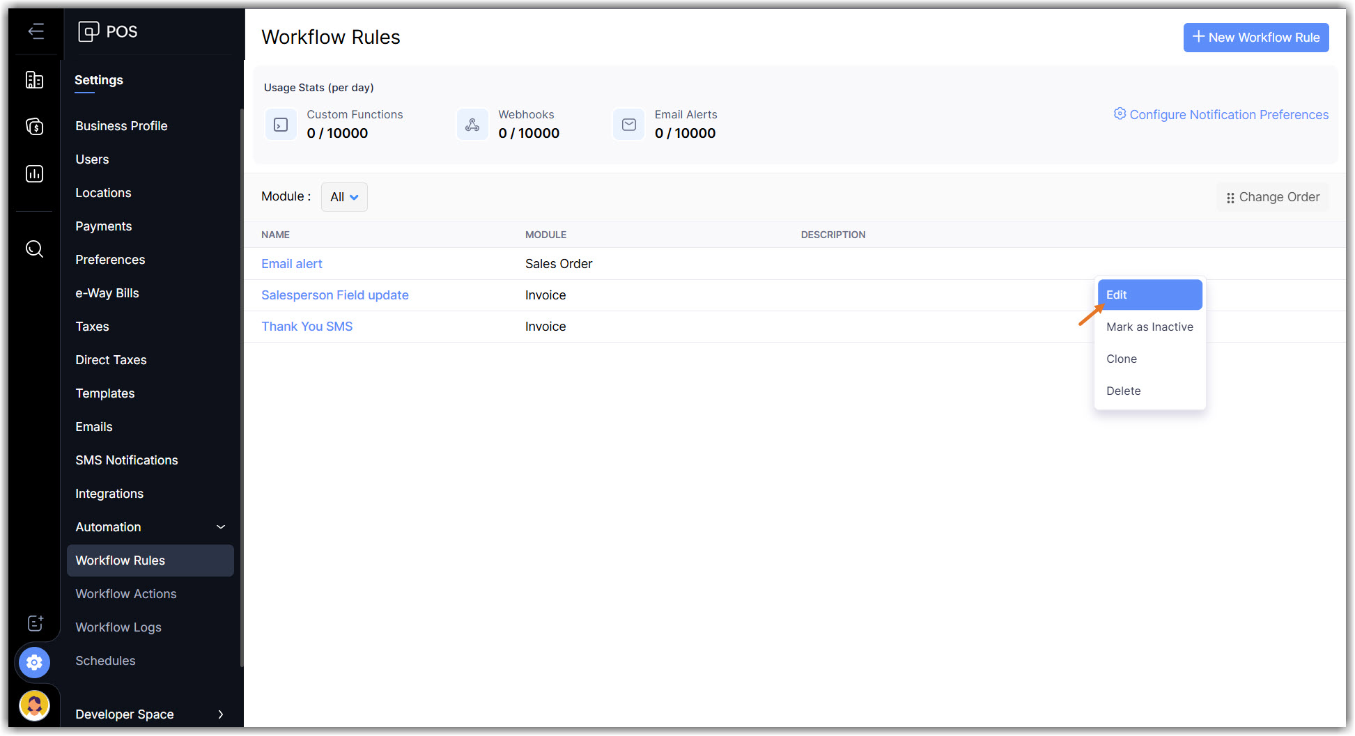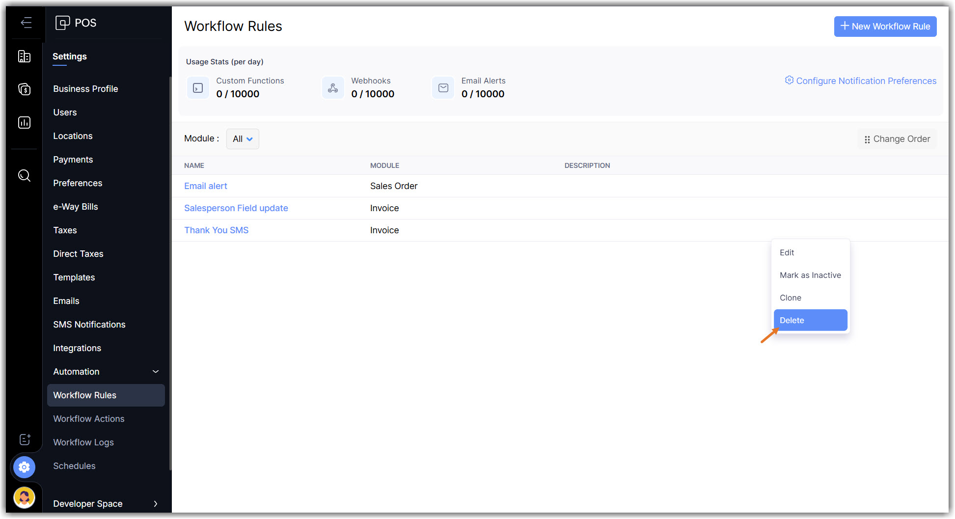 Module: Select the module for the workflow rule from the drop-down menu. For example, Invoice, Order, Customer Payments, and much more.