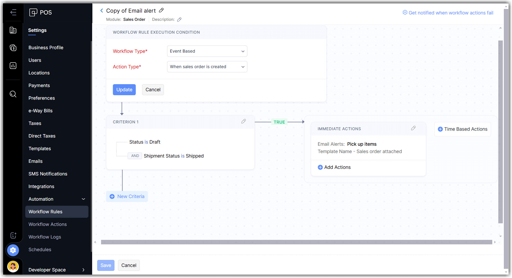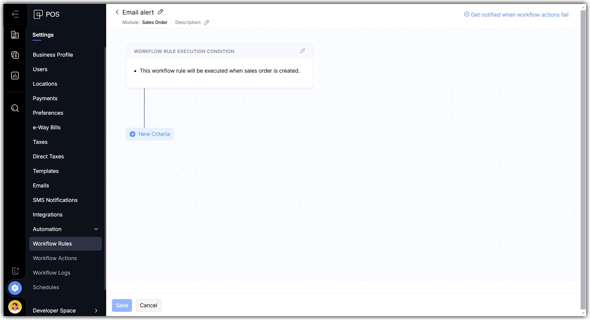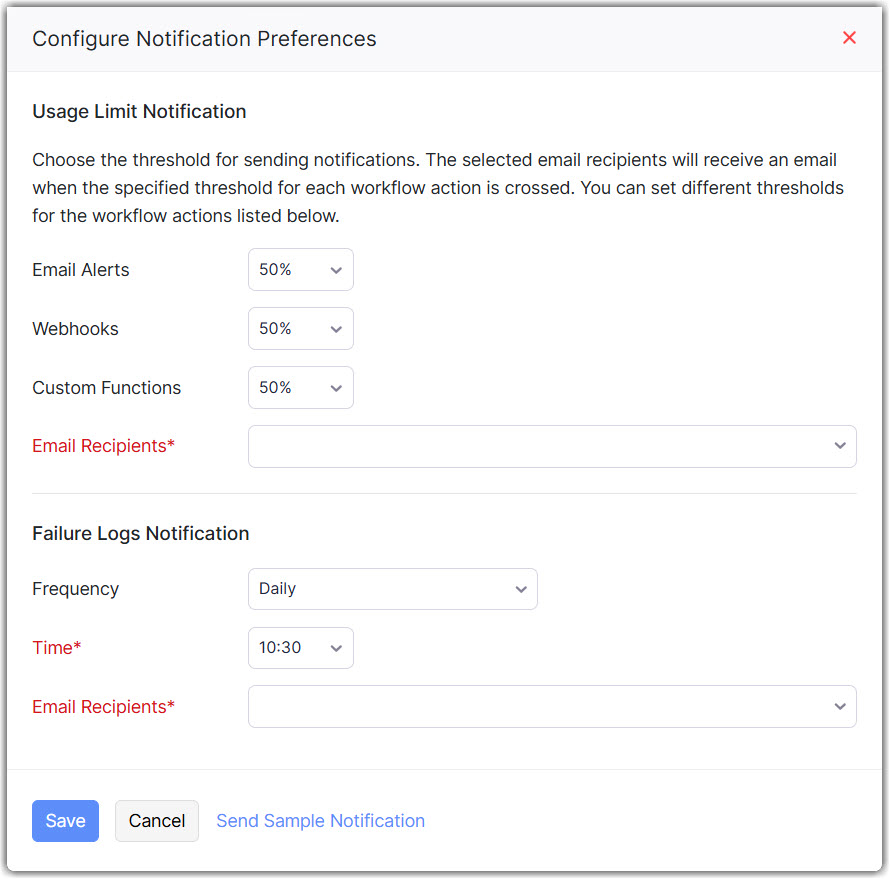 You can set daily limits for workflow alert triggers and add email recipients to get notified when the daily threshold is reached. You can also configure how you receive failure log notifications when a workflow rule fails.