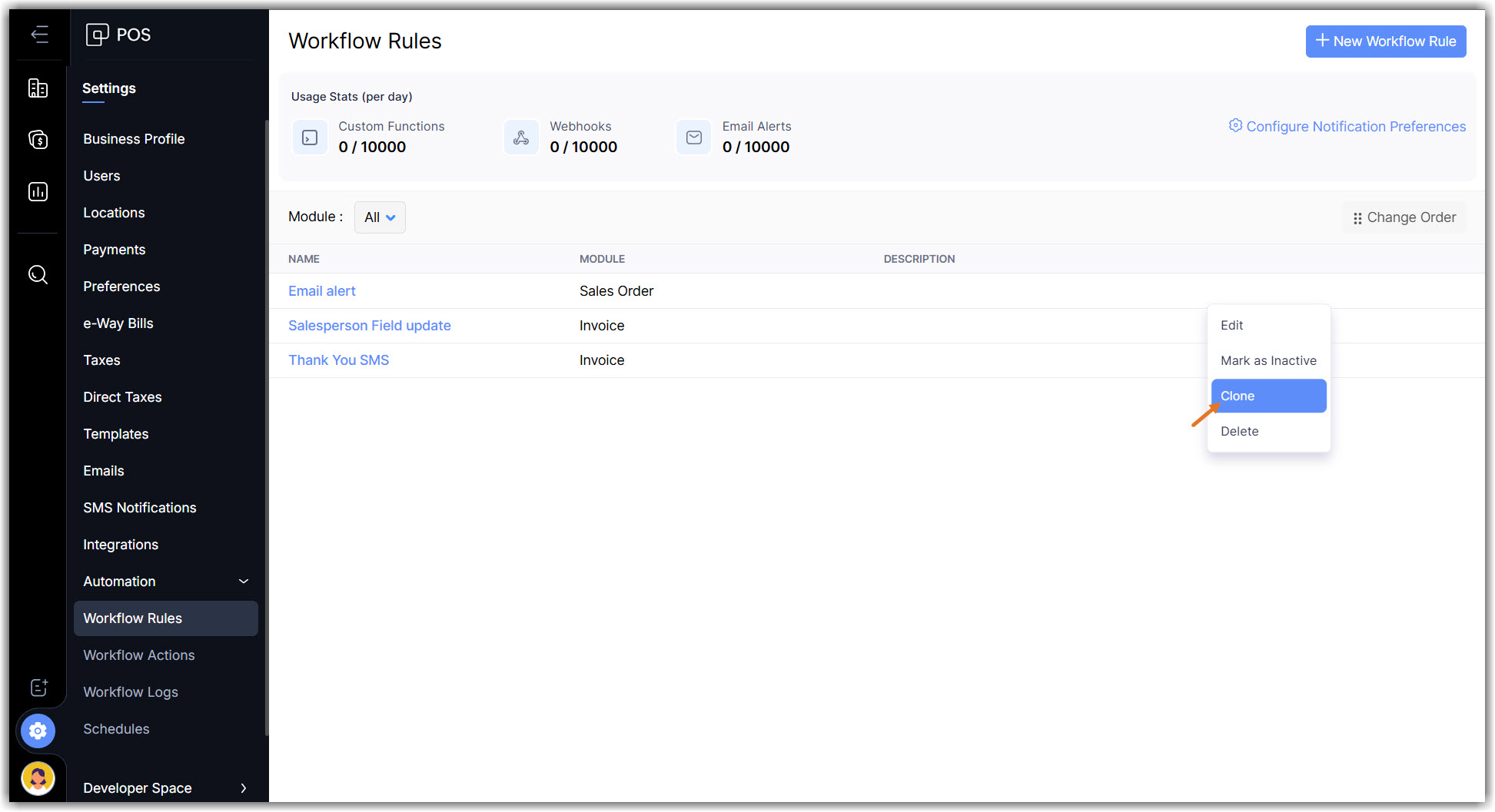 Hover over the workflow rule you want to clone, click the dropdown to the right, and select Clone.