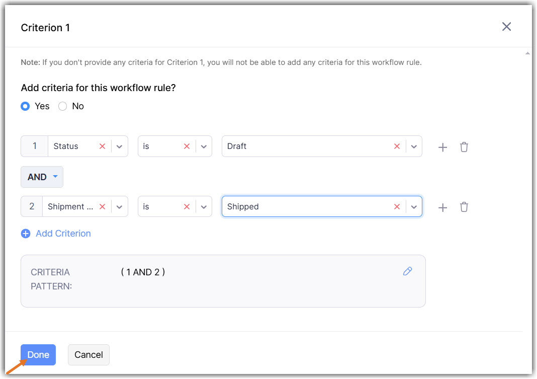 If you add multiple criteria, select either AND or OR from the dropdown based on how you want the criteria to work. You can also edit the criteria pattern by manually entering the criteria in the CRITERIA PATTERN field.