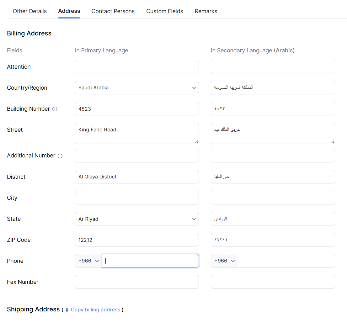Click the Address tab to add the Billing and Shipping addresses. If the Shipping address is the same as that of the Billing address, then you can click the Copy billing addressbutton.