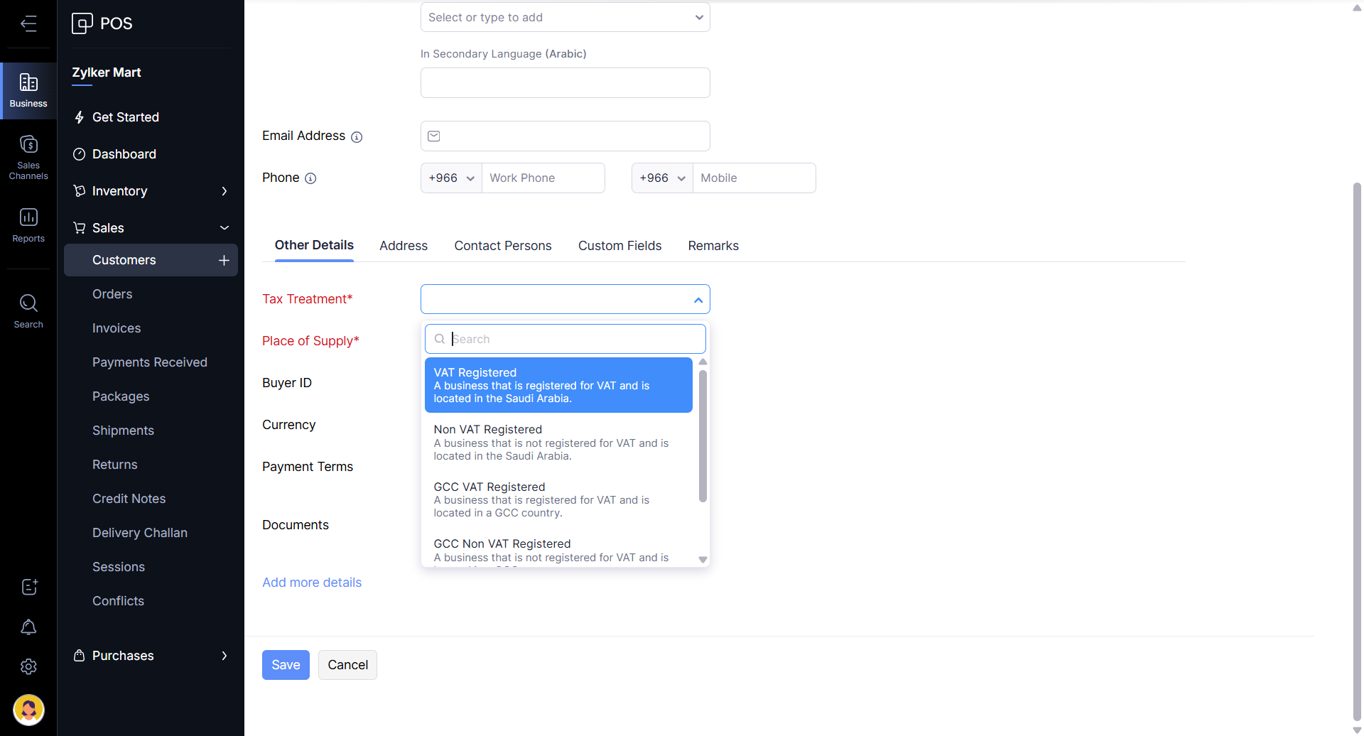 In the Other Details section, specify Tax Treatment, Place of Supply, Currency, and other information.