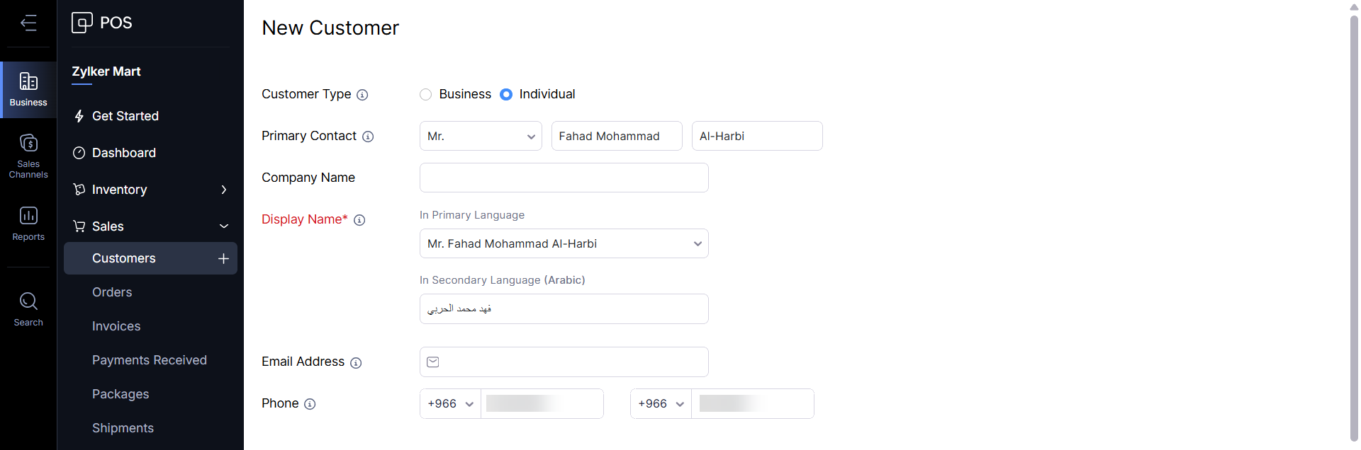 The default language for customer names and addresses follows your Print Language preference. For example, if you print language is Arabic, the details you enter will be treated as Arabic. You can then add the same details in other languages by choosing the Collect in other language option.
