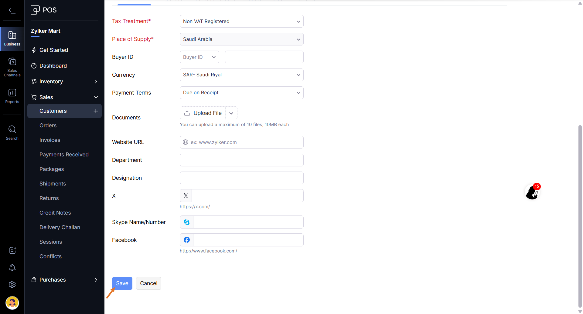 The following information can be specified in the Customers module of Zoho POS.