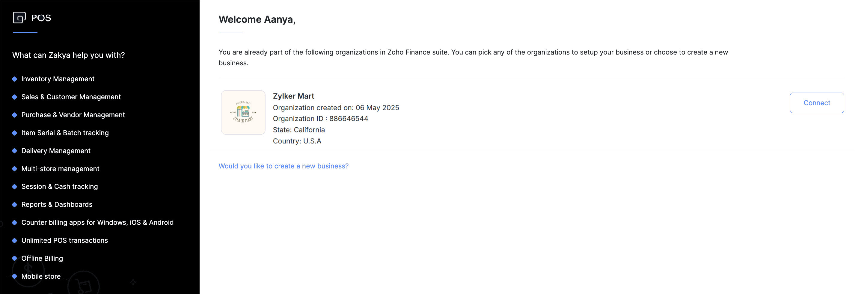 Click Connect against the organization that you want to use with Zoho POS. Alternatively, you can also click Create Organization to create a new organization.