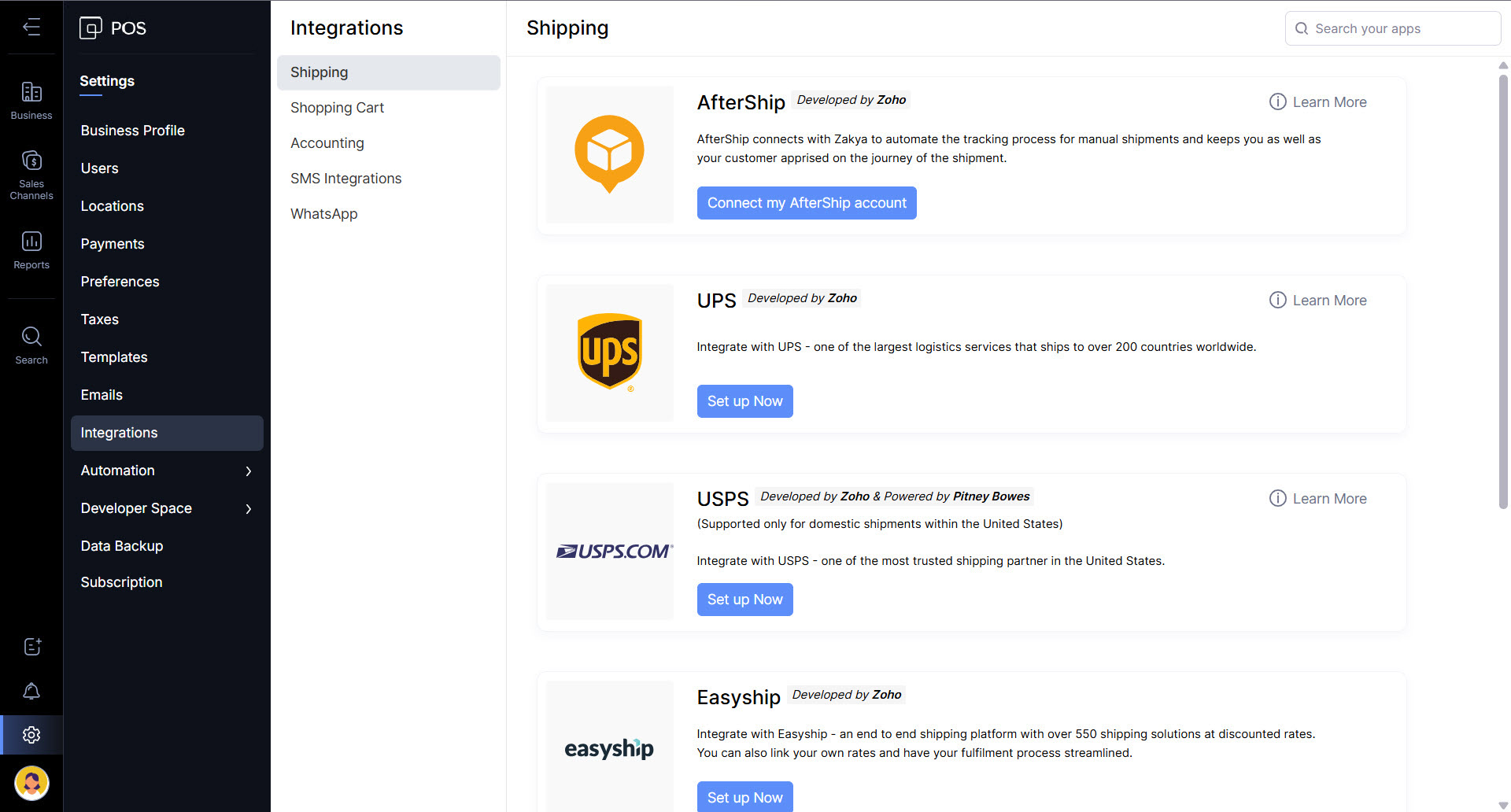 Various third party shipping channels, such as DHL Express and Aramex, can be integrated with Zoho POS, which helps create a shipment for your customers. These shipments can also be tracked by integrating with Aftership. This eliminates the need to switch between multiple applications for shipping and tracking. You can also integrate with Twilio to send automated reminders via SMS regarding invoices, payments made, and payment reminders.