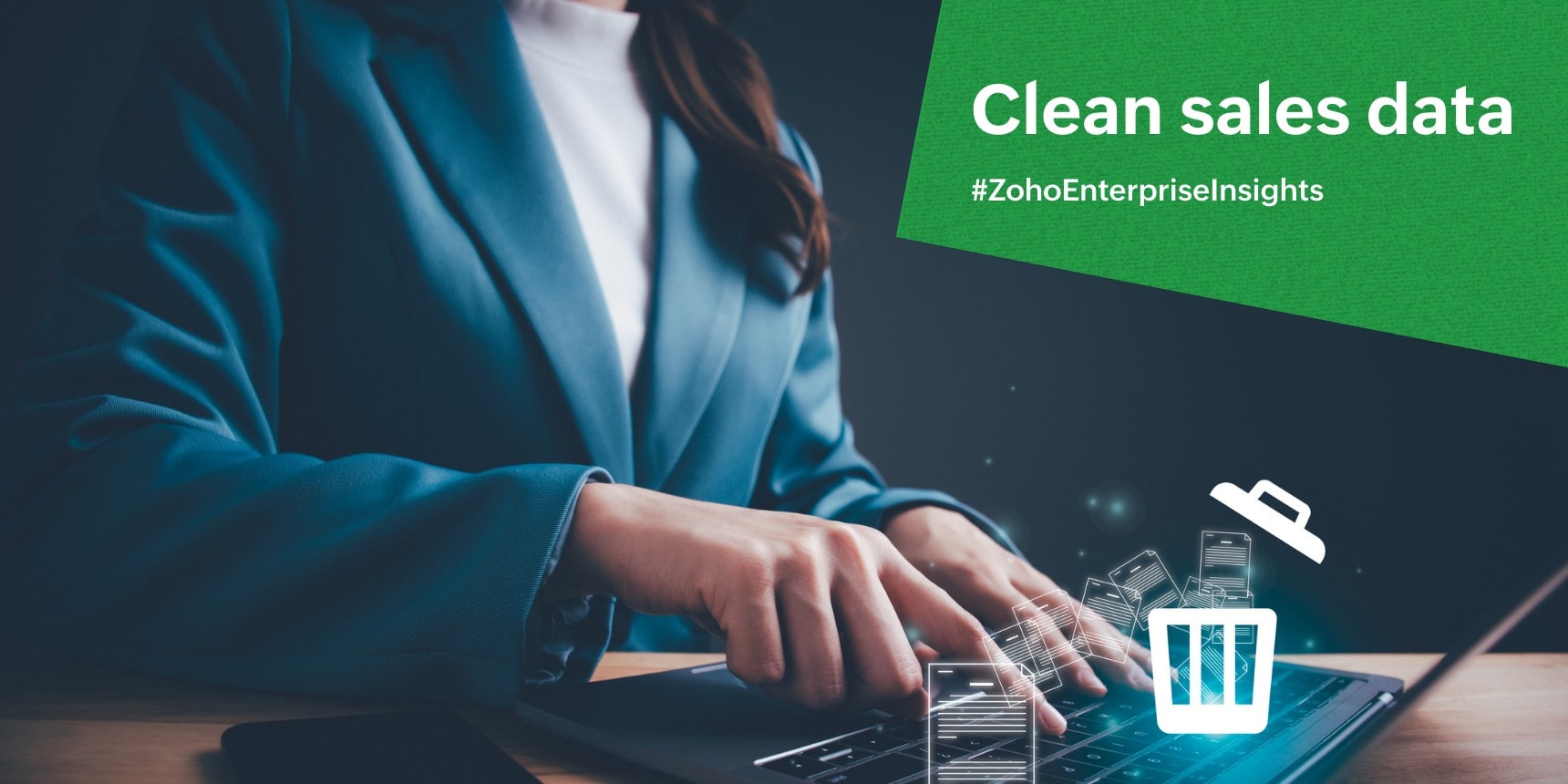 Woman in blazer typing on laptop with icons of files and trash can