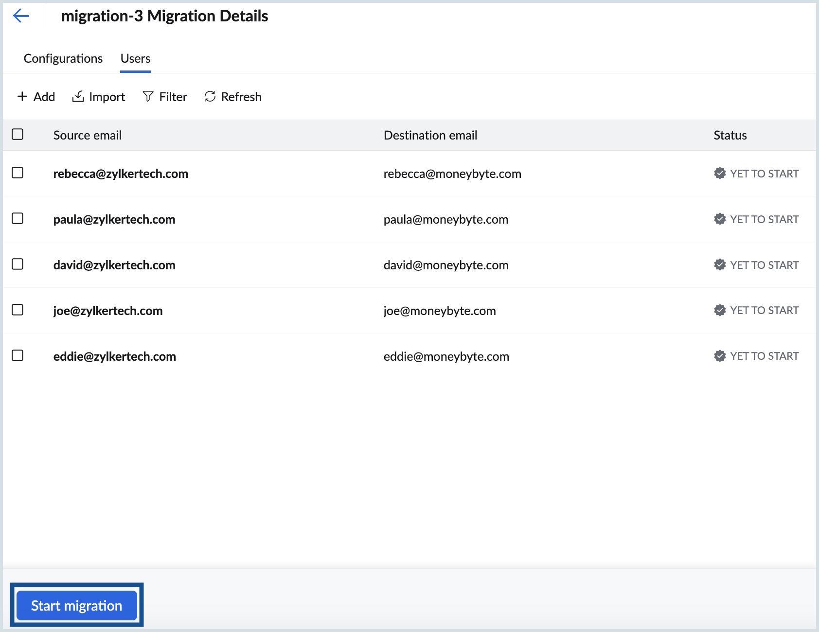 Once users are added, start the migration. To start the migration, follow the below steps: