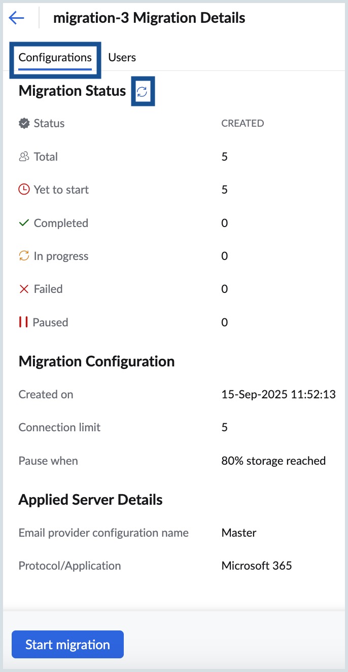 - Migration Configuration: Displays the creation date, connection limits, and pause threshold.