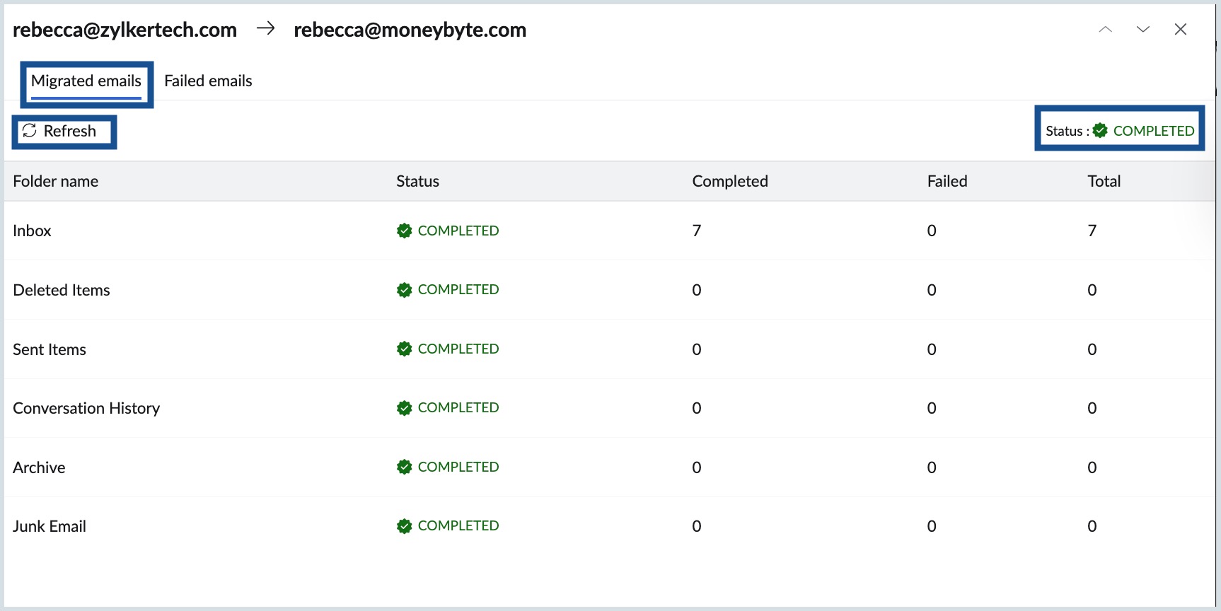 - Status: Aggregate migration status for the selected user (e.g., Completed, In Progress, Suspended).