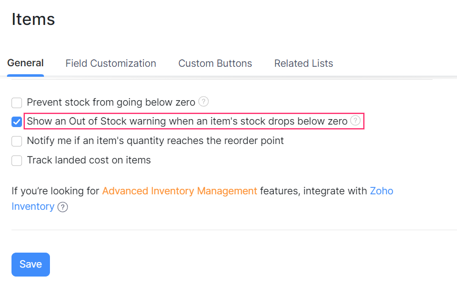 Puede configurar una alerta Agotada en Zoho Books, que activará automáticamente un mensaje de advertencia una vez que sus acciones caigan por debajo de cero. Para configurar la alerta:
