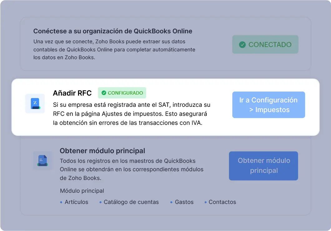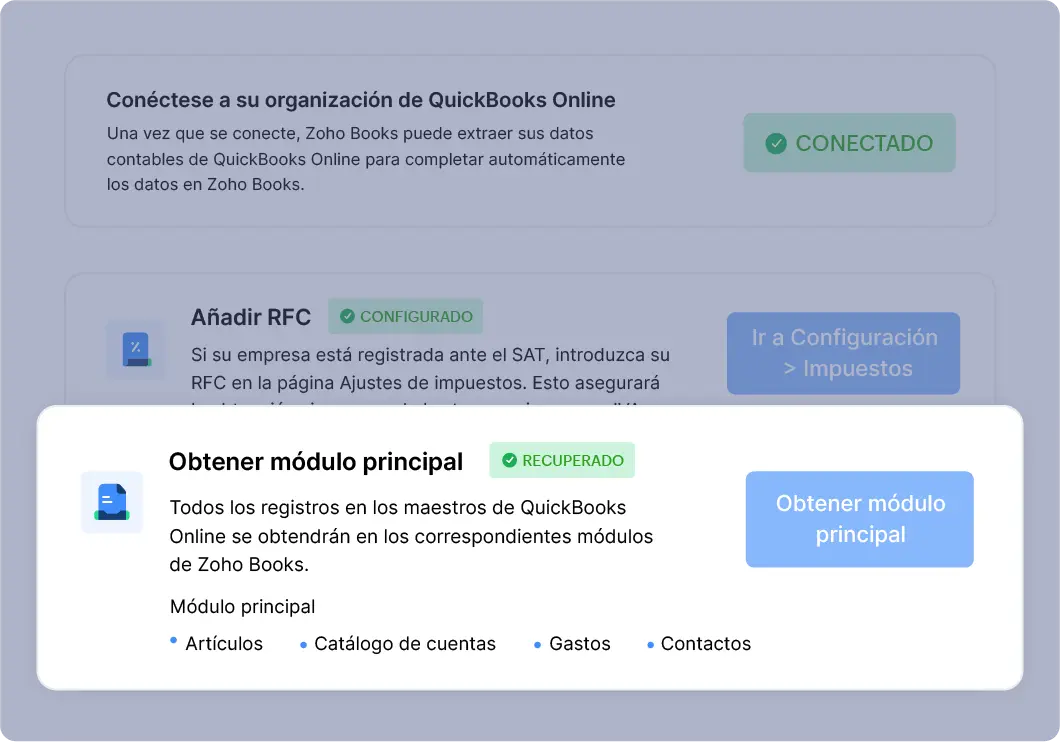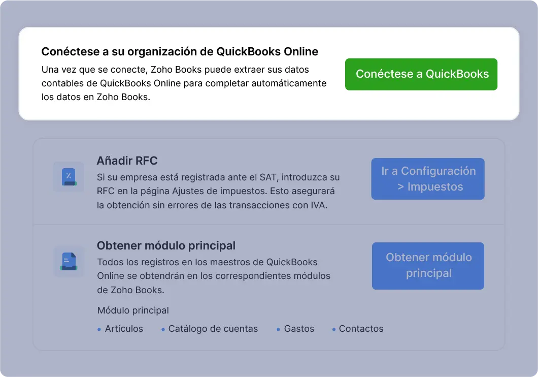 Póngase en contacto con nosotros. Nuestro equipo de expertos en productos y socios certificados le ayudarán a migrar sus datos a Zoho Books.