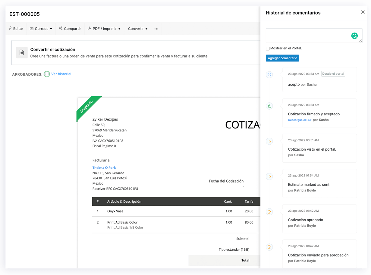 Olvídese de las largas llamadas y correos electrónicos para analizar y finalizar los acuerdos. Utilice el portal del cliente para enviar cotización, obtener su aprobación y colaborar con sus clientes en tiempo real.