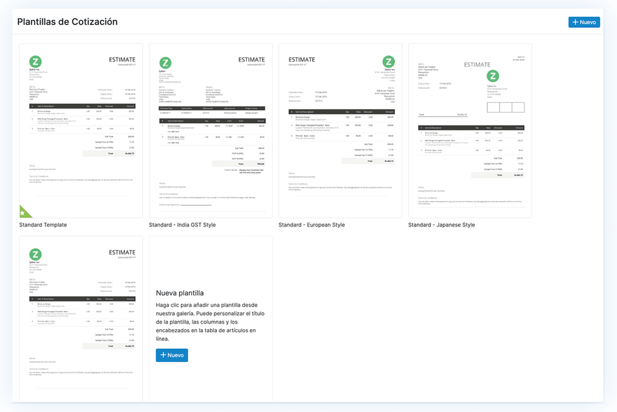 Elija entre la galería de plantillas personalizables para crear cotización que reflejen su marca. Zoho Books le ofrece total libertad para que sus plantillas se vean como desee.