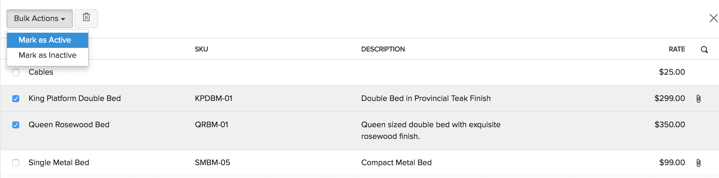Some businesses sell seasonal products that aren’t purchased during certain times of the year. You can mark such items as inactive so they won’t appear when you create a transaction. However, the item will still be available in Zoho Invoice, and you can mark it as active again later if needed.