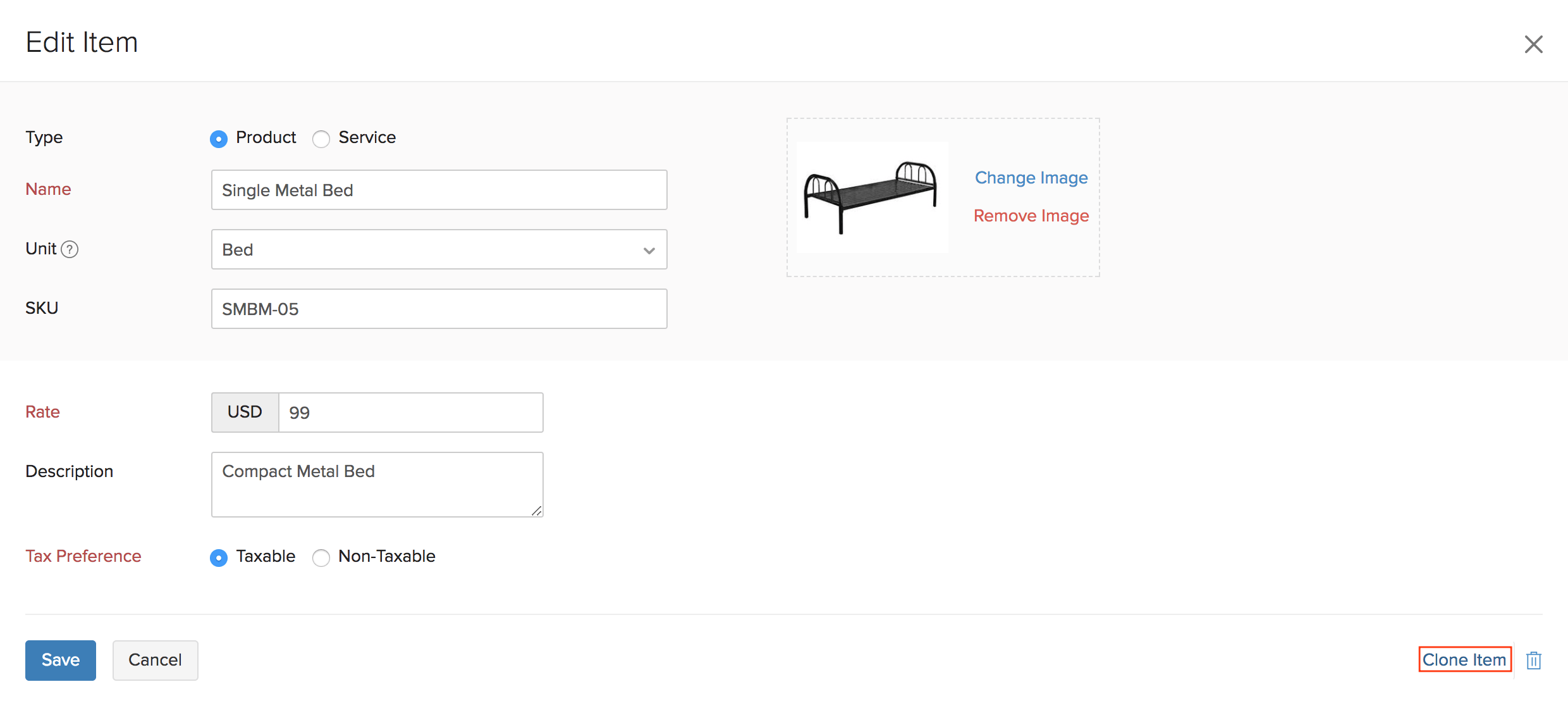 Scenario: One of the furniture products that David popularly sells is chairs. So, David has wisely invested and has a variety of chairs made with different kinds of woods in his inventory. It is mundane and repetitive for David to create chairs as items with only the type of wood being different. So, David creates an item as chair. He clones the item, changes the wood type of the item and saves it as a new item. Thus, David saves his time and spends it productively elsewhere.