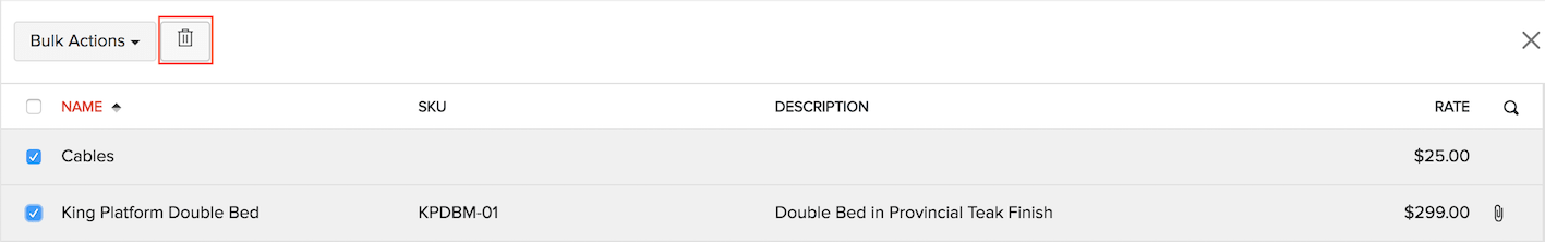 In case, you’ve wrongly entered an item and do not want it in Zoho Invoice, you can delete it. To delete an item: