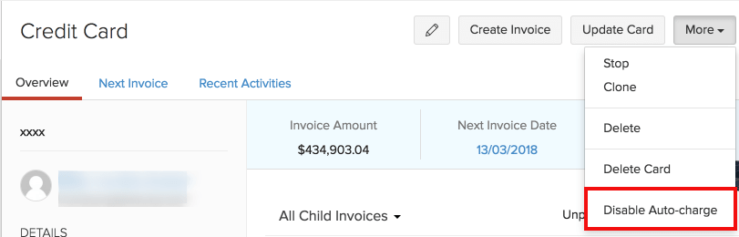• This will disable Auto-charge for your recurring invoice. To enable Auto-charge, select Enable Auto-charge from the More drop down.