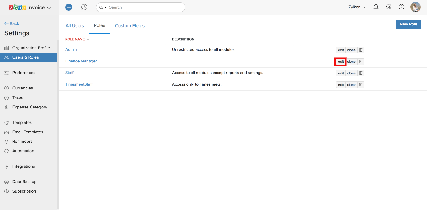 Click on the edit option present next to the role created under Settings > Users & Roles > Roles.