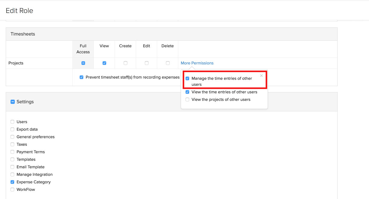 Select the More Permissions option and check the Manage the time entries of other users box to enable the permission for the role.