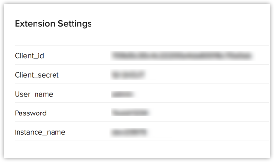 Copie estos datos y péguelos en la sección Ajustes de la extensión de la página Detalles de la extensión. Los valores de Nombre de usuario y Contraseña indican el nombre de usuario y la contraseña de su instancia y no de su cuenta de desarrollador. (ServiceNow cuenta con nombres de usuario y contraseñas independientes para las instancias y las cuentas de desarrollador).