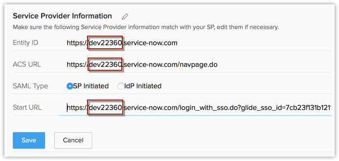 Obtenga su Nombre de instancia y su ID del sistema de ServiceNow e ingréselos en la sección Detalles del proveedor de servicios.