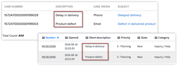 La integración de datos se asignará en función del campo Descripción de Zoho CRM y en el campo Descripción breve en Incidentes. Asegúrese de proporcionar una descripción de los casos.