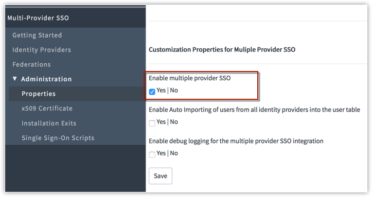 - En la página Propiedades de inicio de sesión con proveedor múltiple, seleccione la casilla Habilitar inicio de sesión con proveedor múltiple y haga clic en Guardar.