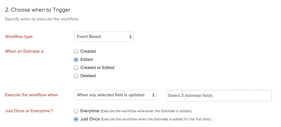 Execute When: Created or Edited Rule Criteria: When Total=1000 and Discount > 500. Immediate Action: — Time Based Action: Update the field Customer Notes 10 days after Estimate Date.