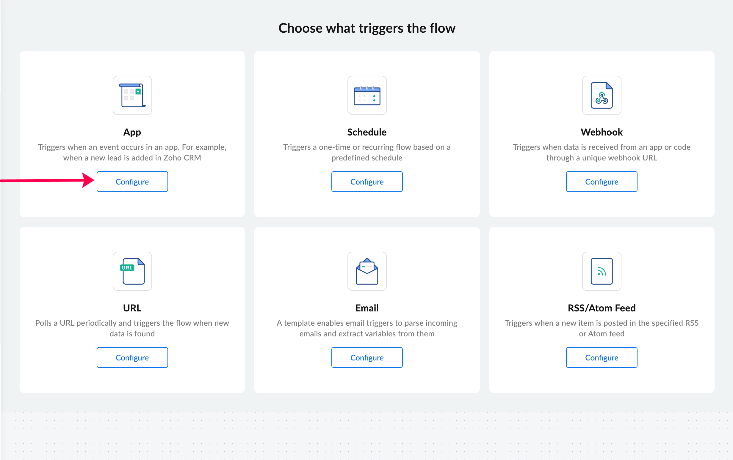 - Click Configure in the app trigger box to choose an application (Calendly) as the trigger.