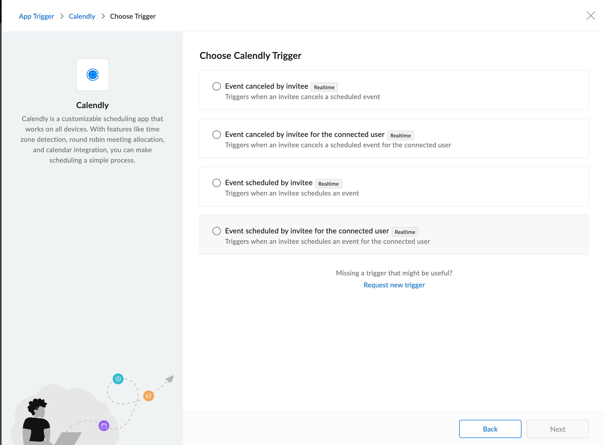 - Select your preferred app (Calendly), and choose Event scheduled by invitee as the trigger.