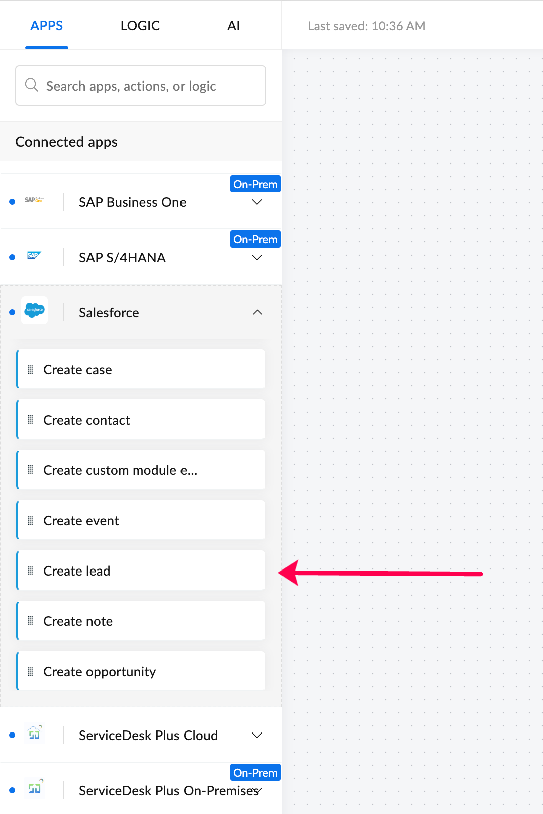 - In the builder, on the left side, under Apps, search for Salesforce.