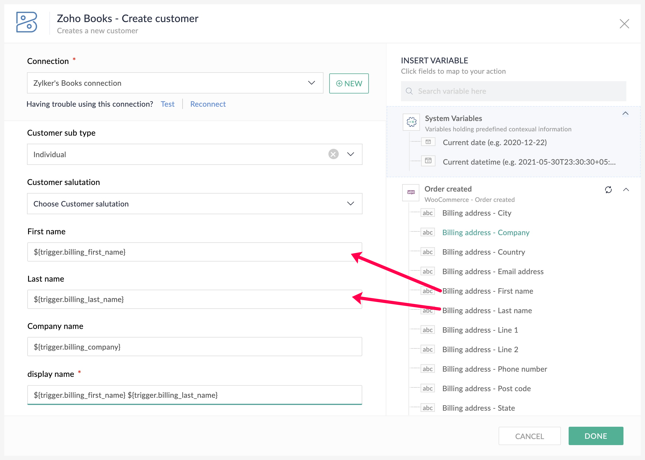 - Map the variables from the WooCommerce trigger to the respective fields that are required, then click Done.