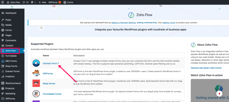 - From the sidebar menu, navigate to Zoho Flow > Contact Form 7.