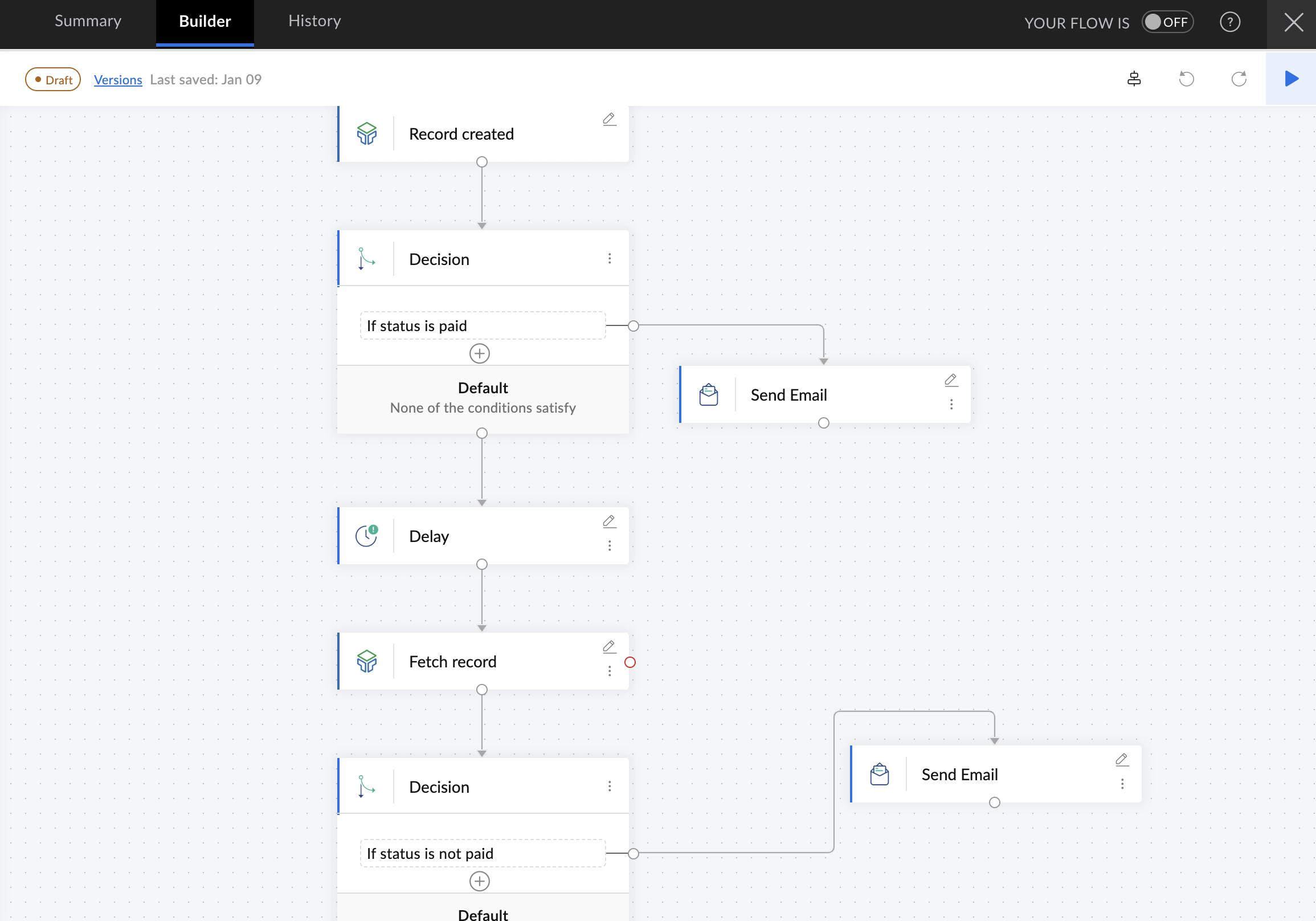 In the above workflow, a payment table in Zoho Tables tracks customer payments after consultations. When a customer completes payment, a thank-you email is sent to them immediately. If no payment is recorded within one day, an automated reminder email goes out.
