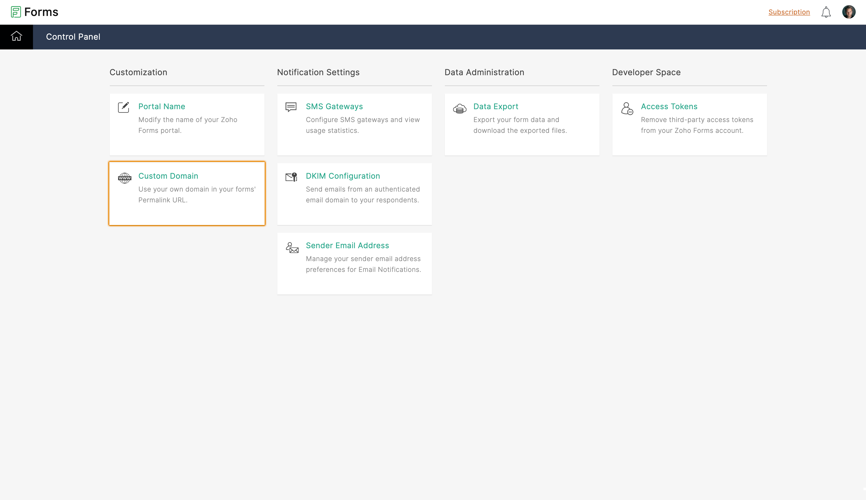 Custom Domains are used to showcase your organization's brand in the form URLs shared to all your form respondents. They can help increase the number of responses to your forms.