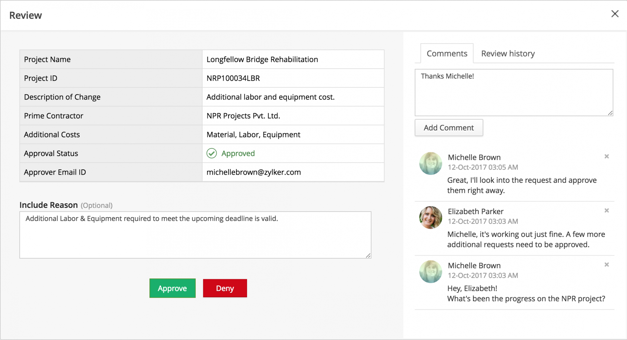 Approvers analyze the entries in a report, and can approve or deny them. They can have discussions over form data and include their reason for approval/denial.