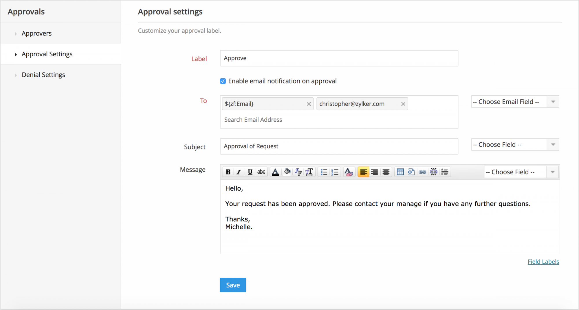 To receive an email notification every time an entry is approved, check the "Enable email notification on approval" checkbox. Compose the email and click Save. You can send the email to the users in your organization or to the respondent of that particular form.