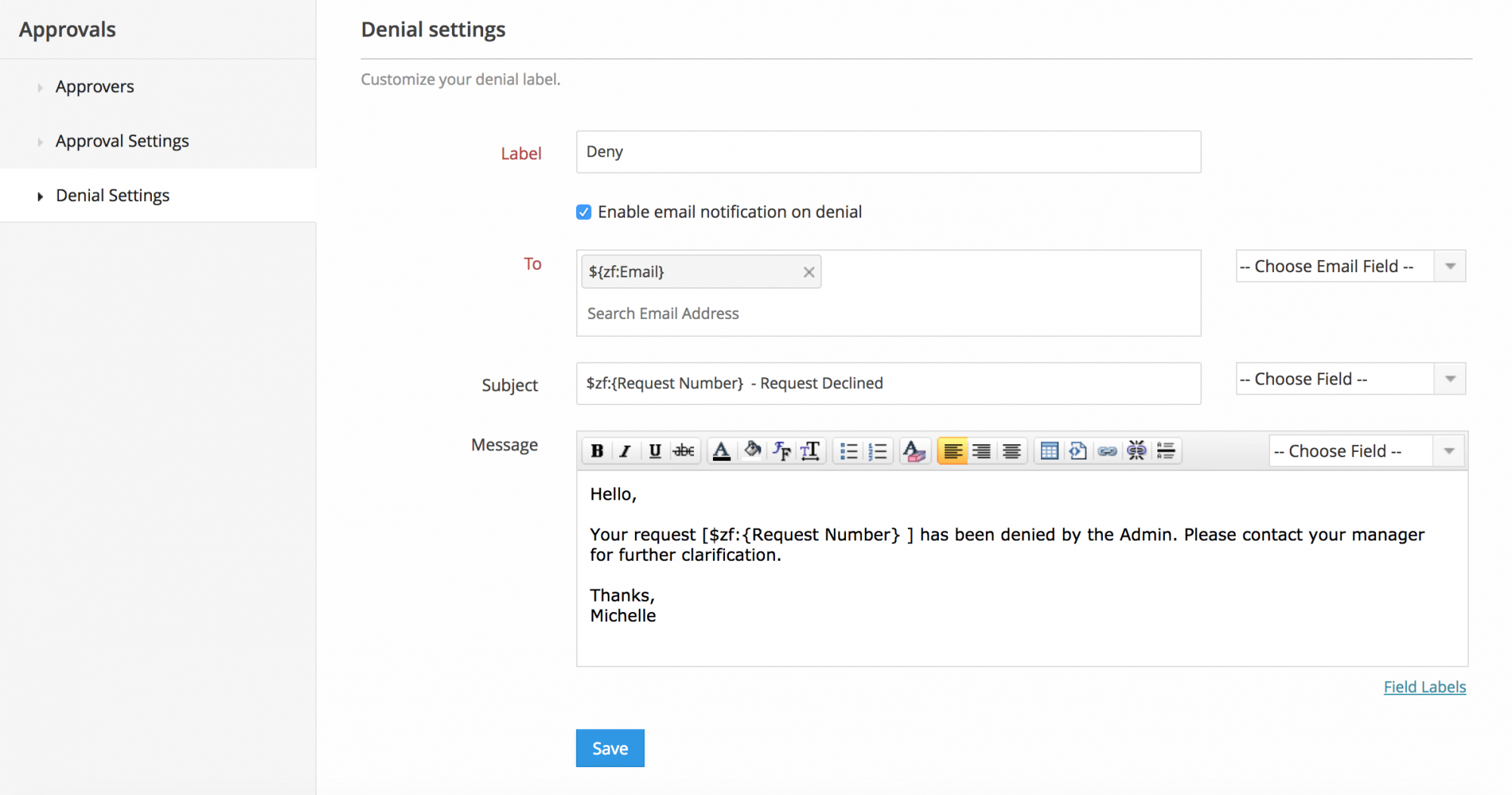 To receive an email notification every time an entry is denied, check the "Enable email notification on denial" checkbox. Compose the email and click Save. You can send the email to the users in your organization or to the respondent of that particular form.
