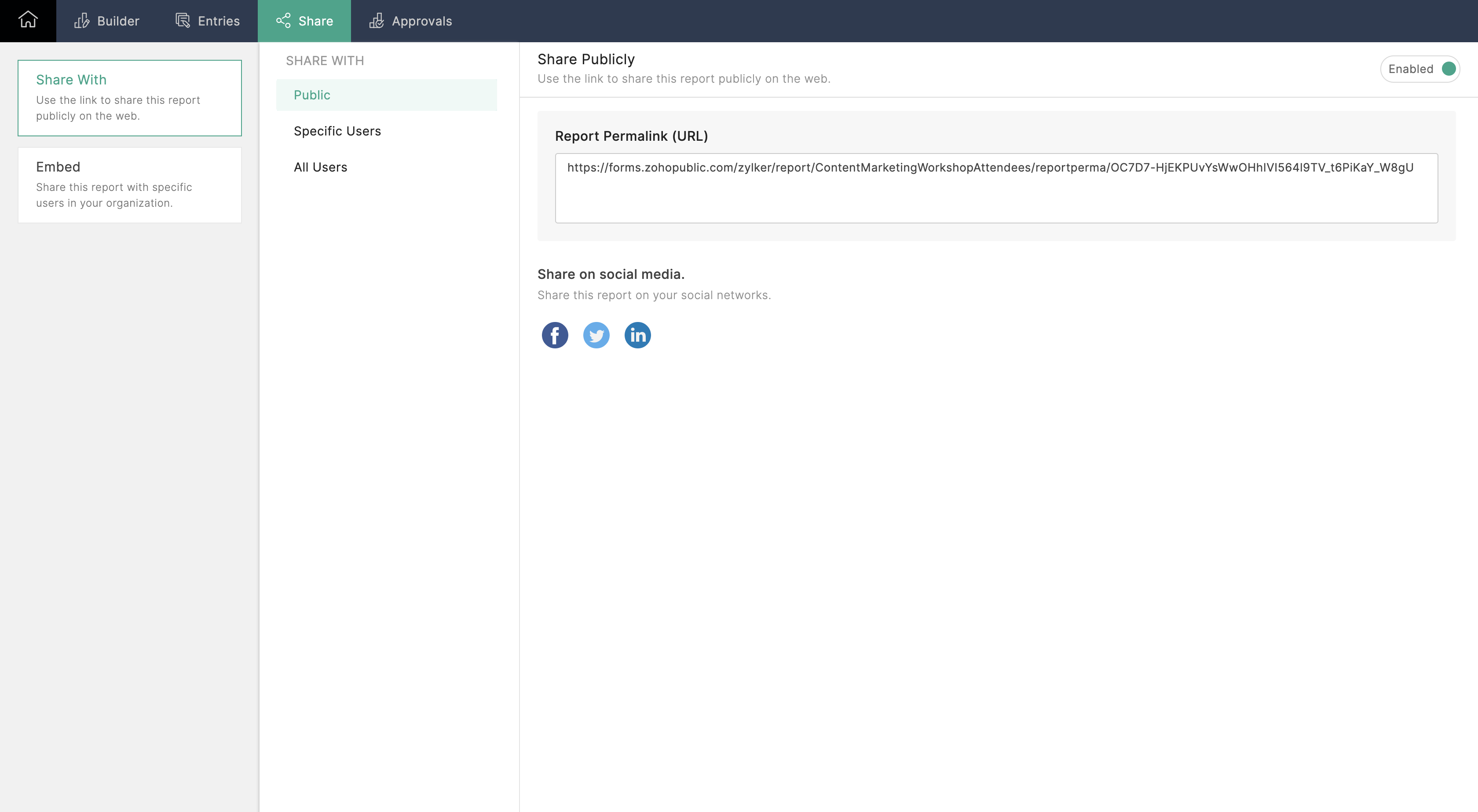 Note: If the public URL of a report is disabled, the report will no longer be accessible through the link shared via any medium (direct link, social media sharing, email campaigns), or any embed codes used in the web pages.
