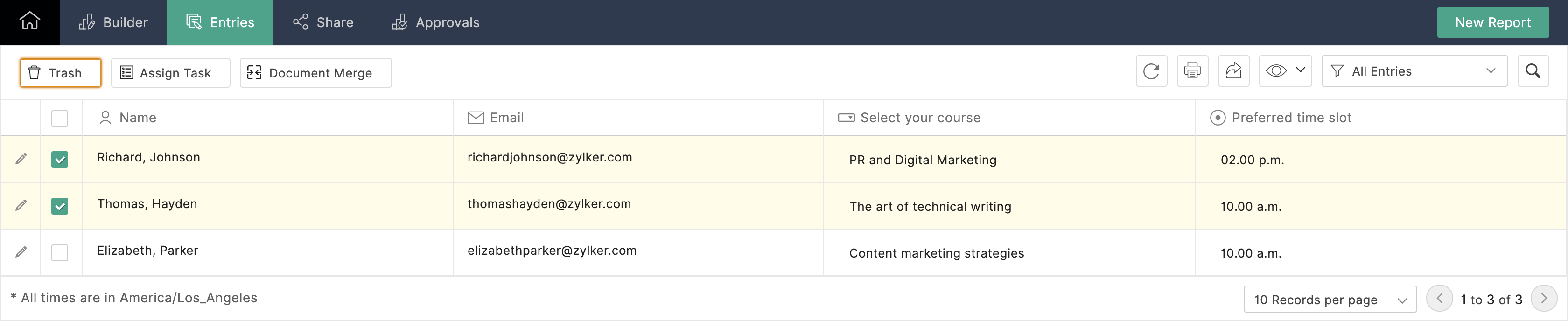 - Select the entries that you wish to trash from the list of entries and click Trash.