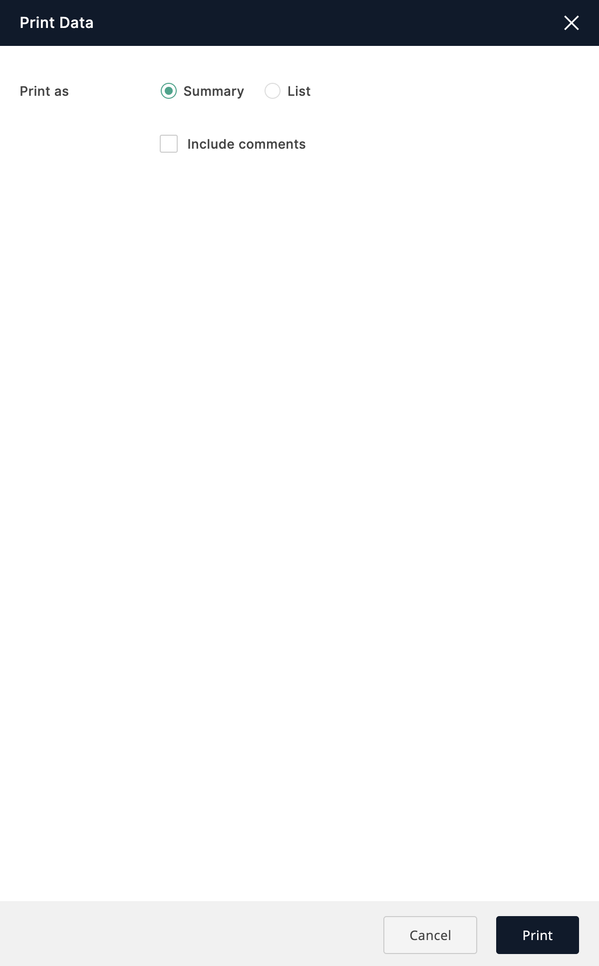 - You can choose to include comments in the printed data by selecting the Include comments option.