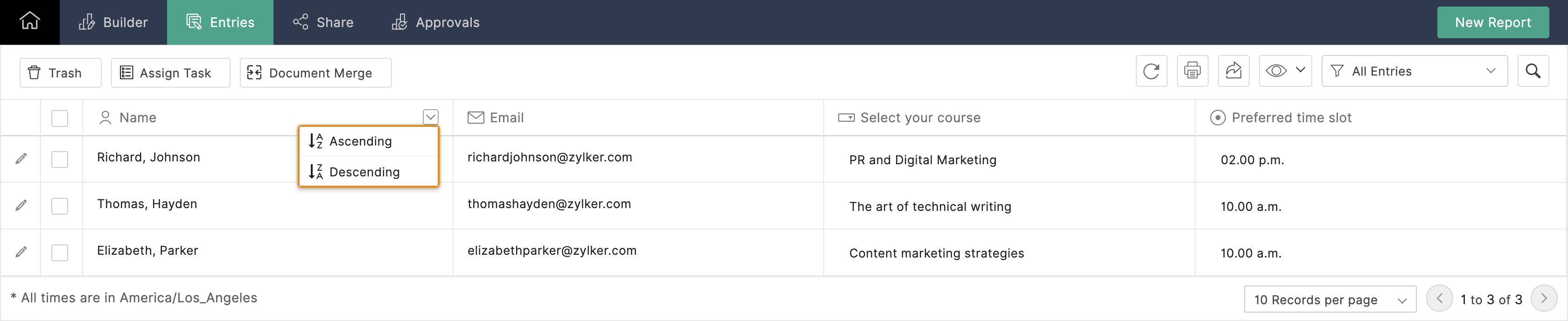 To sort entries in a particular column in ascending or descending order, click the drop-down button, and select Ascending or Descending. If you have assigned values to a choice based field, you can also view the values assigned.
