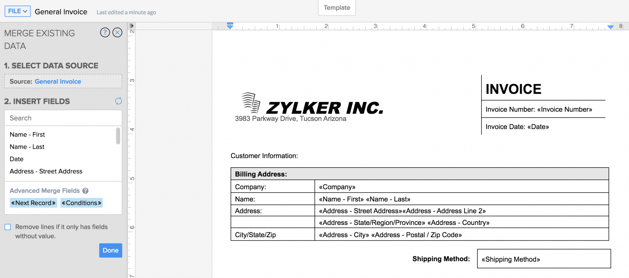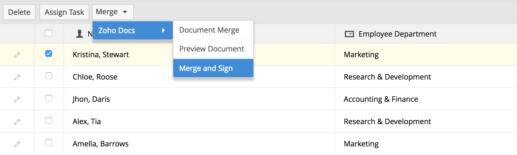 - Choose Merge >> Zoho Docs from the dropdown menu.