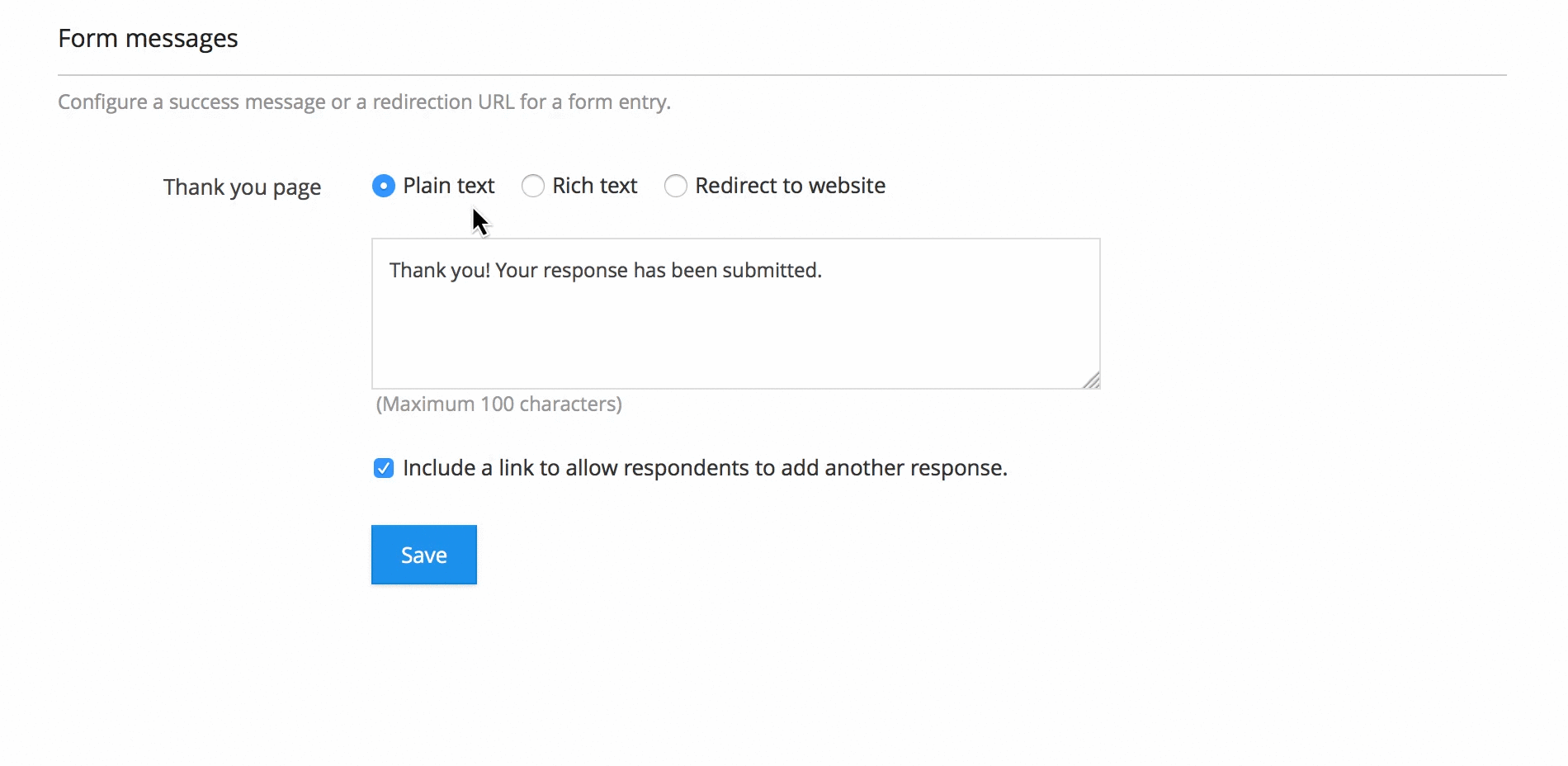 Plain text: Use this option if you want a simple Thank you page with a plain message.