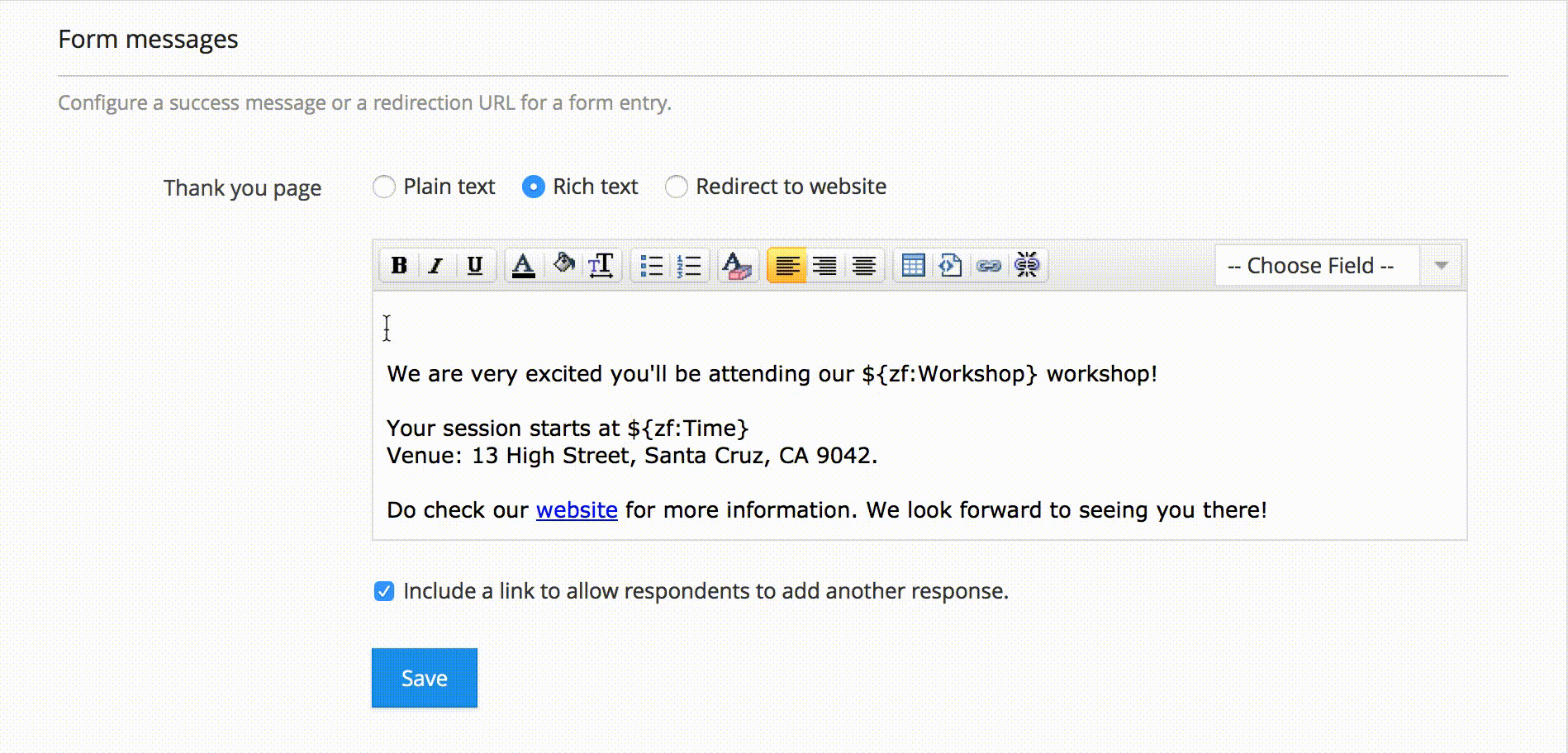 - Rich text: Use this option to provide useful links, include bullet points, create tables, and format the text message - change colors, italicize the text, etc. You can even personalize your page by using your respondent's answers to frame your message. To do so, choose the form field from the drop-down provided. The respondent's input would automatically appear in place of the form field.